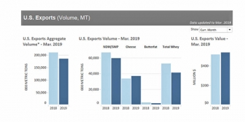 Se refleja el volumen total de exportaciones más alto en siete meses, pero las ventas a China se desploman a medida que continúan las tarifas de represalia. Los proveedores estadounidenses movieron volúmenes récord de queso en marzo, encontrando una creciente base de clientes en Corea del Sur, Japón, el sudeste asiático, la región de Medio Oriente / África del Norte (MENA) y América Central. Los proveedores de ingredientes también lograron mejores ventas en el sudeste asiático.