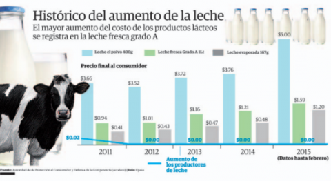 Miriam Lasso de la revista Panama America señala que más de 45 millones de dólares pagarán los consumidores con el nuevo aumento en el costo de la leche, que fue notificado por las empresas procesadoras ante la Autoridad de Protección al Consumidor y Defensa de la Competencia (Acodeco).