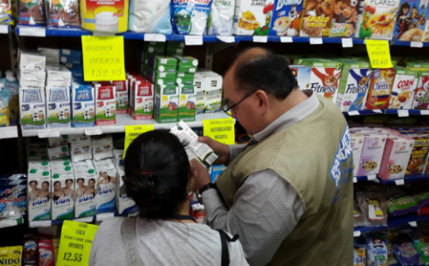 La fotografía muestra a Herbeth Ordóñez del Departamento de Verificación de la Dirección de Atención y Asistencia al Consumidor (DIACO) de Guatemala quien verifica la presencia de NutriLeche en los comercios para determinar que el producto en mención cumpla con el RTCA y evitar así publicidad engañosa.