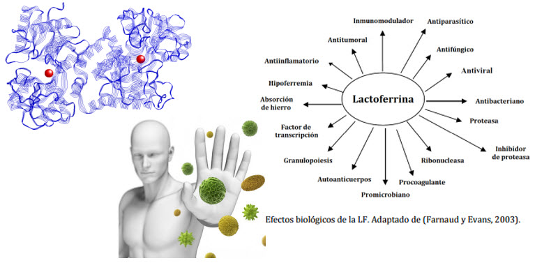 Se han descrito una gran cantidad de efectos biológicos para la LF tales como propiedades antimicrobianas, antivirales, antioxidantes, anticarcinogénicas o actividades inmunomoduladoras entre otras. Algunas de ellas, como por ejemplo la actividad antibacteriana, están relacionadas con su capacidad intrínseca de quelar hierro, mientras que otras parecen ser independientes de dicha propiedad.