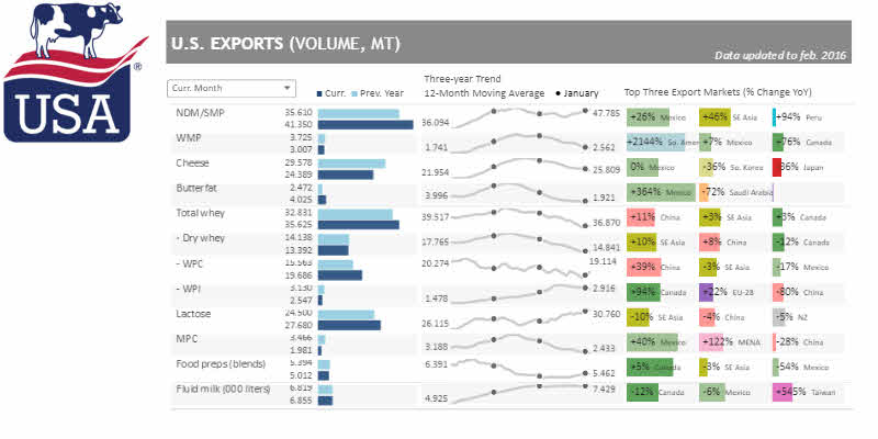 Los comportamientos de las exportaciones de productos lácteos en Estados Unidos en febrero mostraron algunas sorpresas, las tendencias observadas desde el año pasado continua. Las exportaciones de la leche en polvo sin grasa / leche descremada en polvo (NDM / SMP), queso y suero de leche se mantienen en una velocidad baja; la lactosa se mantiene en movimiento; la leche líquida es constante; y las ventas de la grasa de mantequilla, leche entera en polvo (LEP) y concentrado de proteína de leche (MPC) son sólo una fracción de lo que eran en su pico en el 2014.
